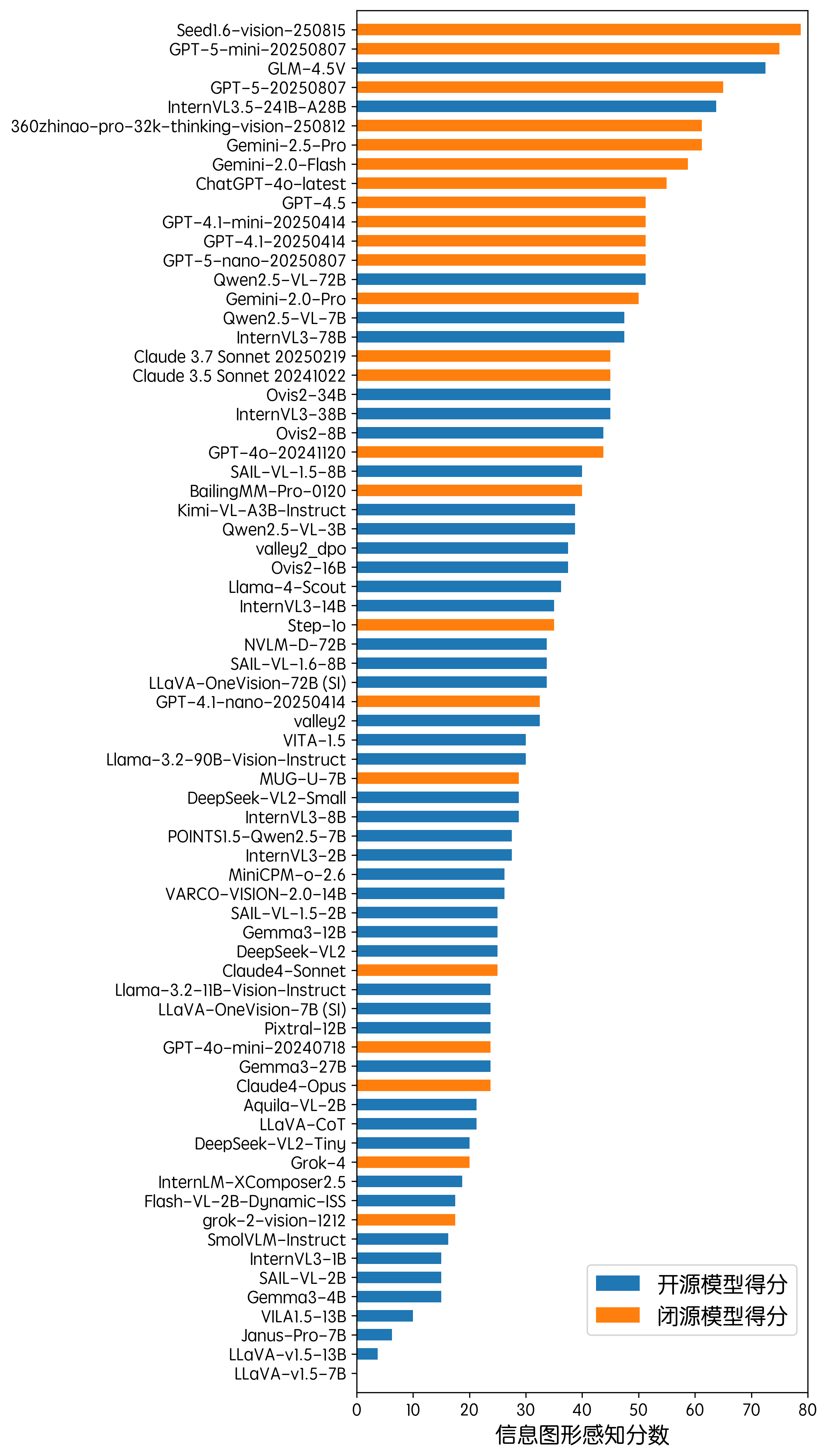 在信息图形感知方面,Seed1.6-vision-250815 在评测中取得了最佳的成绩,而令人惊讶的是,GPT-5-mini-20250807 比 GPT-5-20250807 在这一维度取得了更佳的成绩。整体上,闭源 API 模型在信息图形理解方面的性能处于领先的地位,占据了前 10 名中的 8 席。开源模型则相较上期榜单在这一方面有一定性能提升,但仍凸显不足。