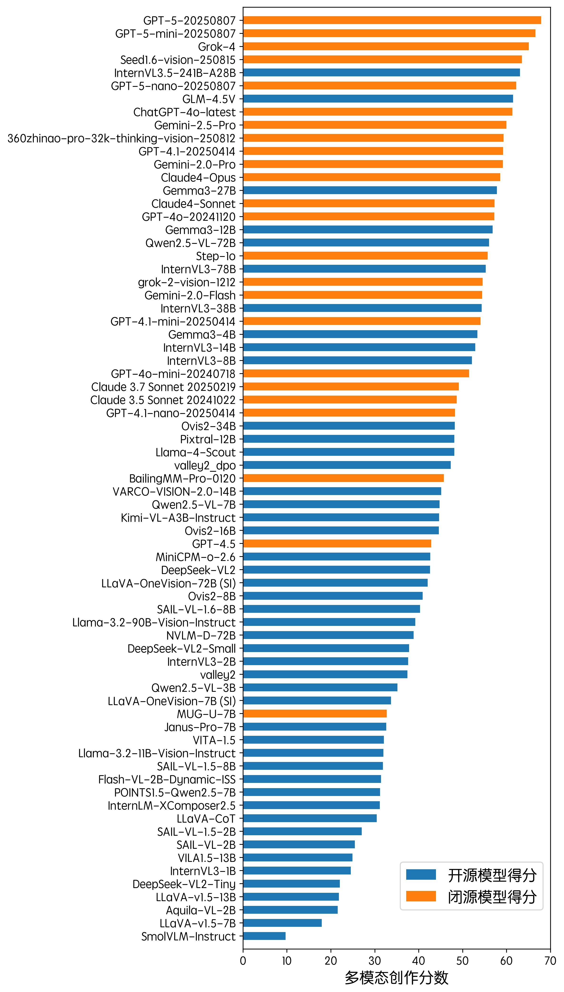 在多模态创作方面,GPT-5-20250807 及其小量级模型 GPT-5-mini-20250807 在评测中取得了前两名的成绩。整体上,闭源 API 模型在多模态创作方面的性能处于领先的地位,占据了前 10 名中的 8 席。开源多模态模型在这一方面仍有一定缺陷,尚待补足。