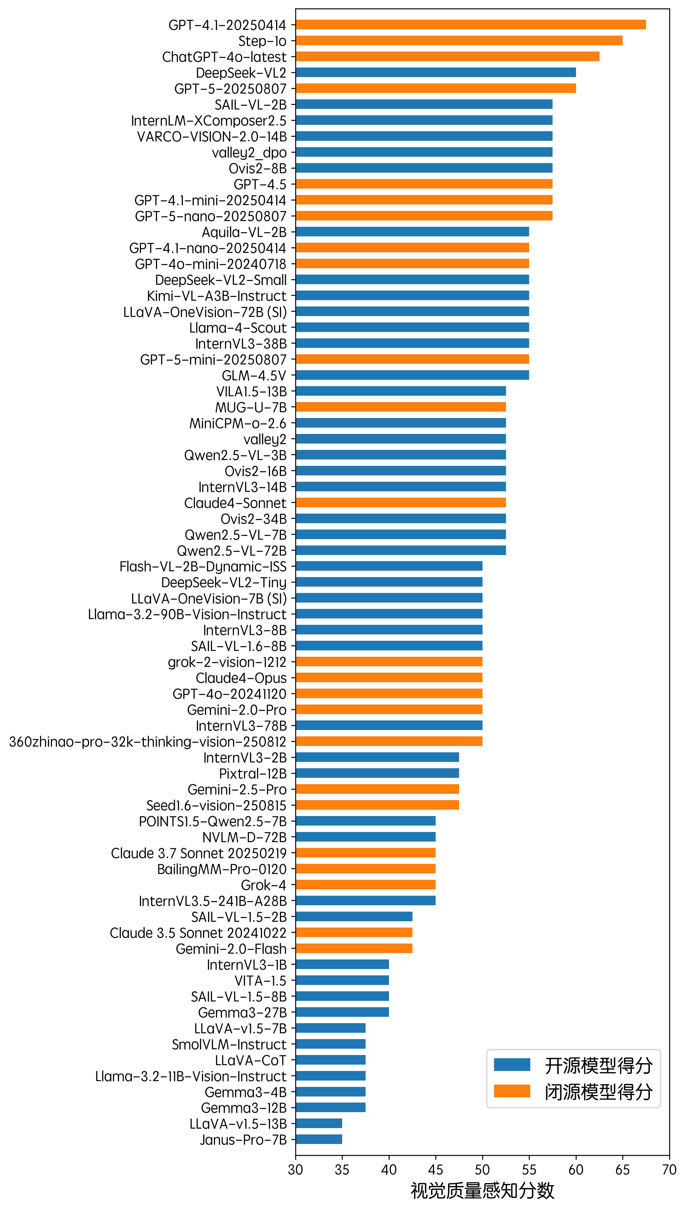 在视觉质量感知方面,在前 5 名中只有 GPT-5-20250807 为本次榜单新近上榜的,展现出目前比较领先的多模态模型(如Seed1.6-vision-250815,InternVL3.5-241B-A28B等)在这一方面仍存在一定欠缺。值得注意的是,小参数量模型,如 SAIL-VL-2B 等,在视觉质量感知上也展现了突出的性能。