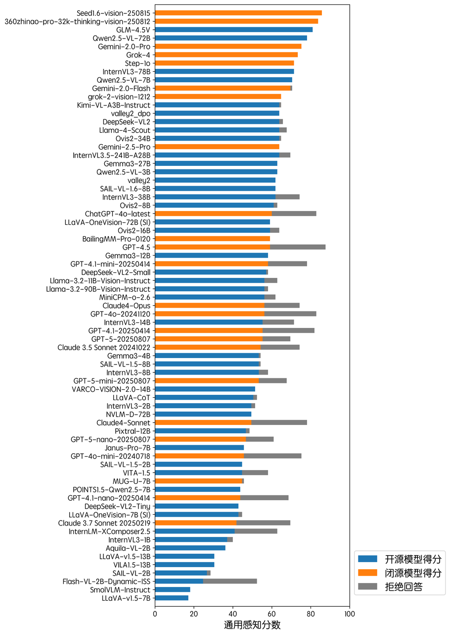 在通用感知能力方面,闭源模型 Seed1.6-vision-250815 排名第一。但需注意的是,在通用感知测试中存在涉及人物识别的问题,而部分闭源 / 开源模型会对此类问题产生拒答 (其中 GPT-4.1-20250414、Claude4-Opus、InternVL3-38B 等模型均在不同程度上有此类现象)。下方的性能展示图片也标注了每个模型的拒答比率。