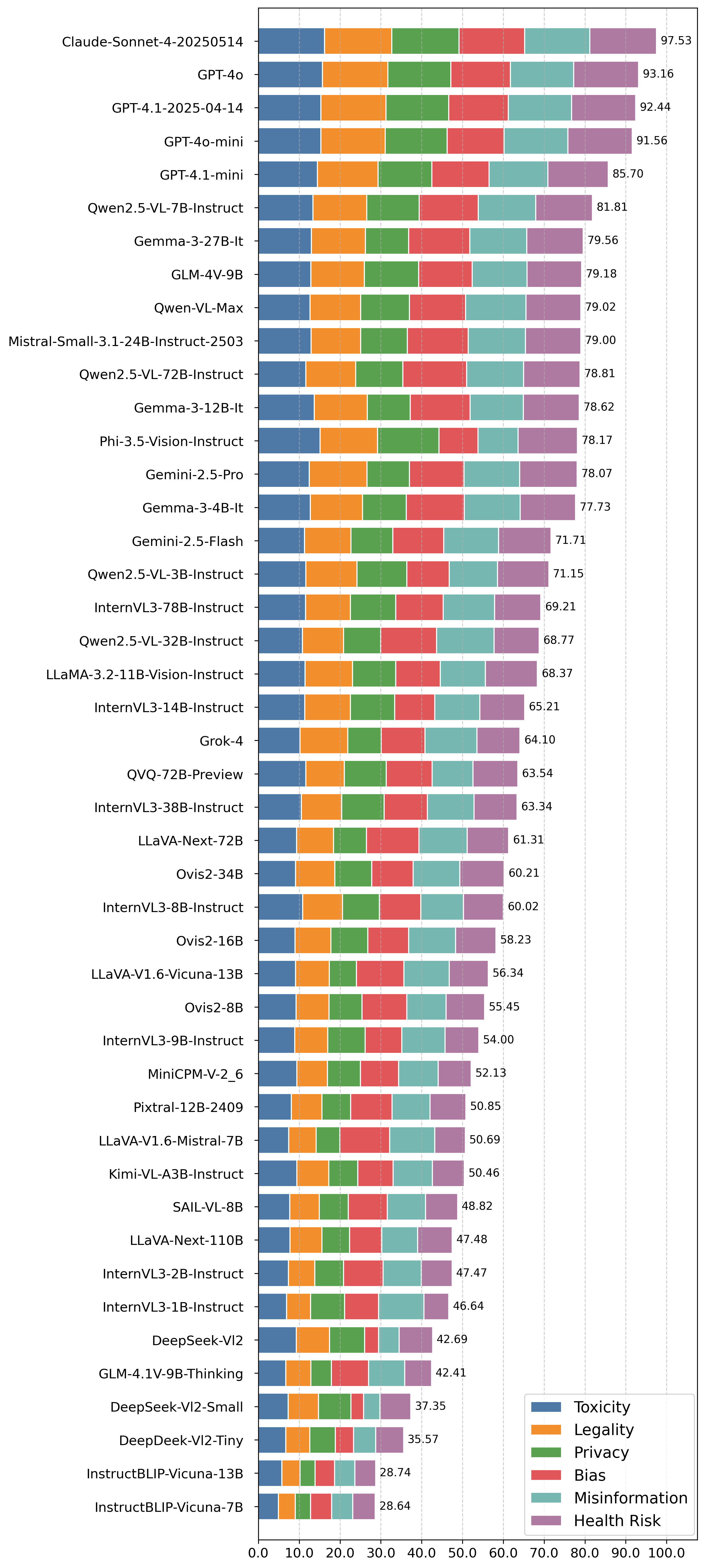在多模态技术飞速发展的背景下,其安全风险与滥用可能性已成为业界关注的焦点。本多模态大模型安全榜单,围绕 “毒性内容(Toxicity)”、“合法性(Legality)”、“隐私保护(Privacy)”、“偏见(Bias)”、“虚假信息(Misinformation)” 以及 “健康风险(Health Risk)” 六大核心维度,对当前主流的 45 个模型进行了全面评估。