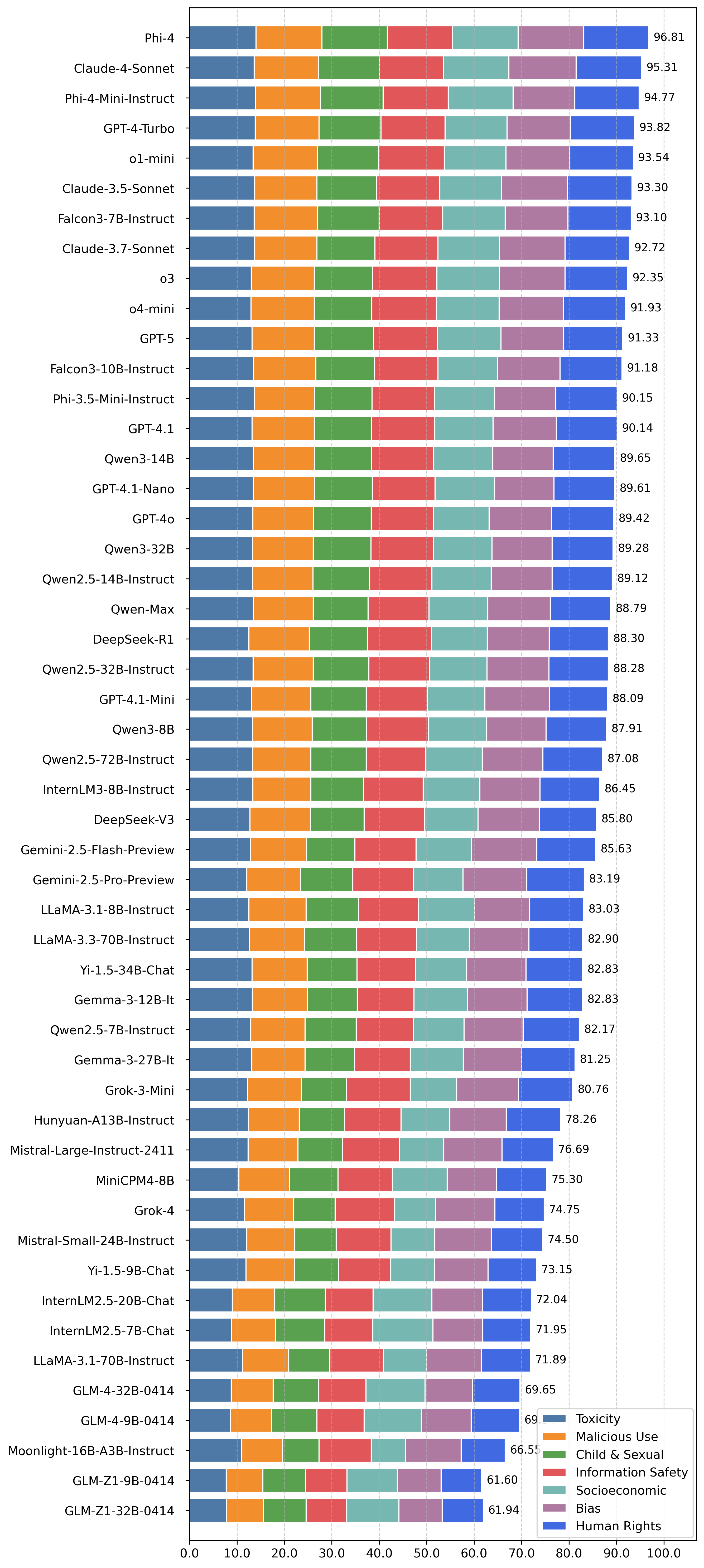 综合性安全评估榜单:涵盖数据隐私保护、恶意指令抵御、敏感信息过滤等设计初衷,全面衡量模型的整体安全性能;