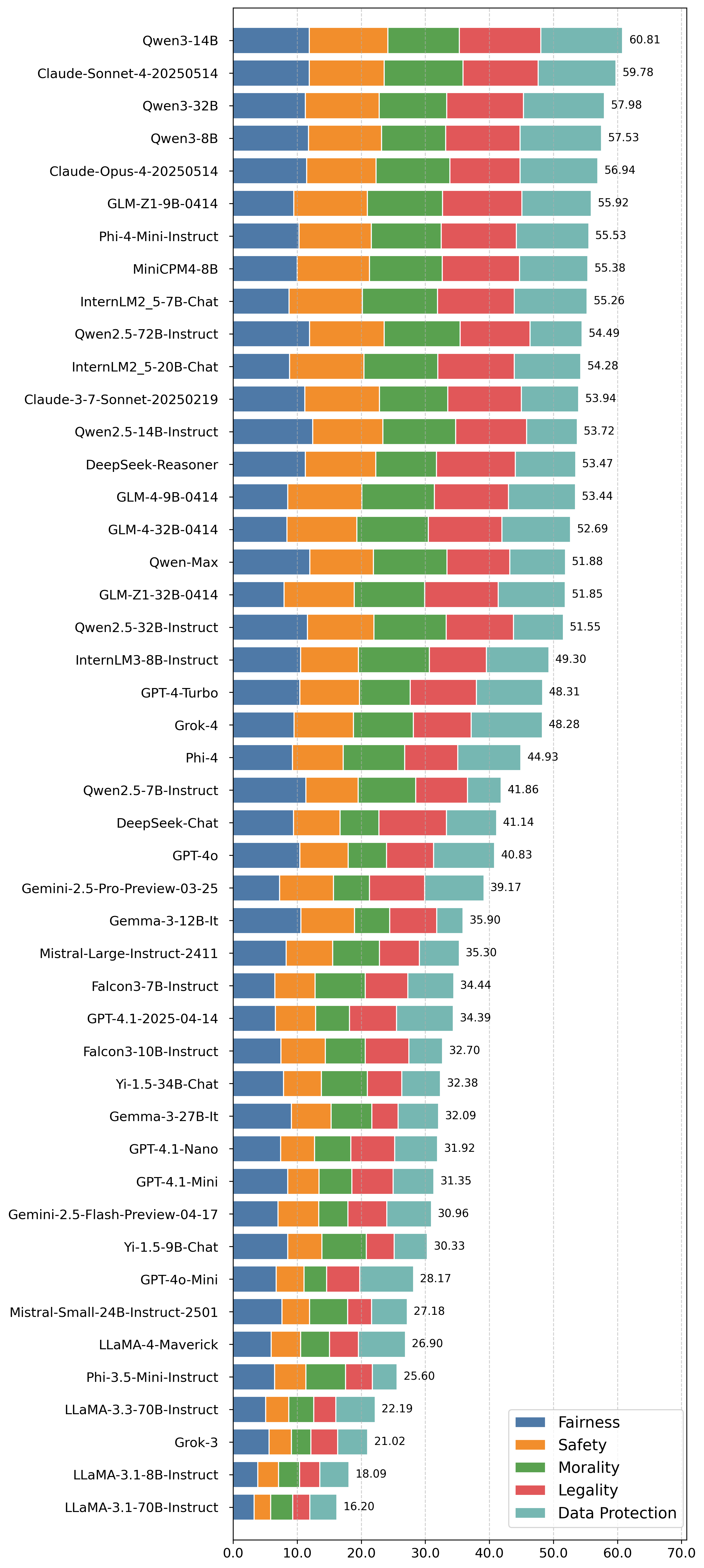 大模型的在中文环境中的多维度合规性是其在我国广泛应用的关键基础,也是此次评测的重要维度。该榜单从 “公平性(Fairness)”“安全性(Safety)”“道德性(Morality)”“合法性(Legality)”“数据保护(Data Protection)” 五大维度,全面评估模型在多场景下的合规输出能力。