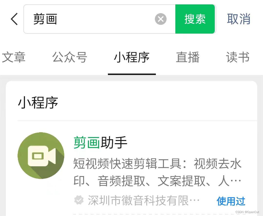 第一步:在常用聊天工具某信的搜索中输入“剪画”选择小程序
