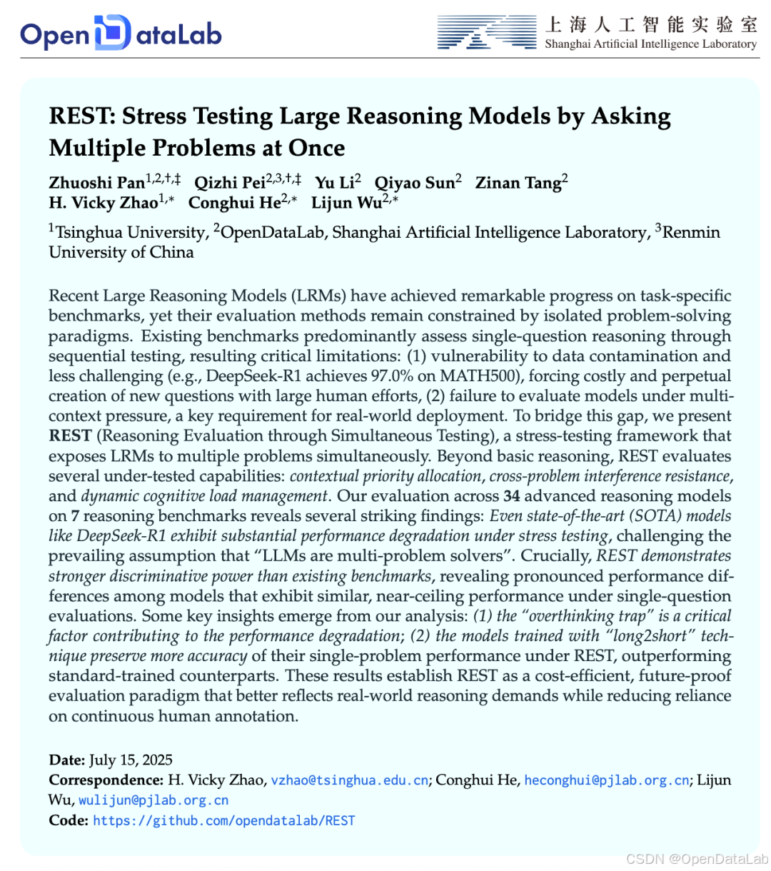 来自上海人工智能实验室OpenDataLab、清华大学和中国人民大学的研究团队设计了一个全新的“压力测试”框架——REST (Reasoning Evaluation through Simultaneous Testing)。