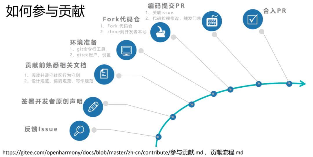 OpenHarmony 社区的发展需要大家共同参与,开发者参与社区贡献的最主要方式是提 Issue 和 PR。当开发者发现问题时,可以通过提 Issue 的方式表达出来。开发者可以通过提 PR 解决相关问题。在提 PR 之前,开发者需要签署开发者原创声明,熟悉相关文档和代码编写规范,并配置环境,准备Git 命令行工具、Gitee 账户,设置账户信息等。