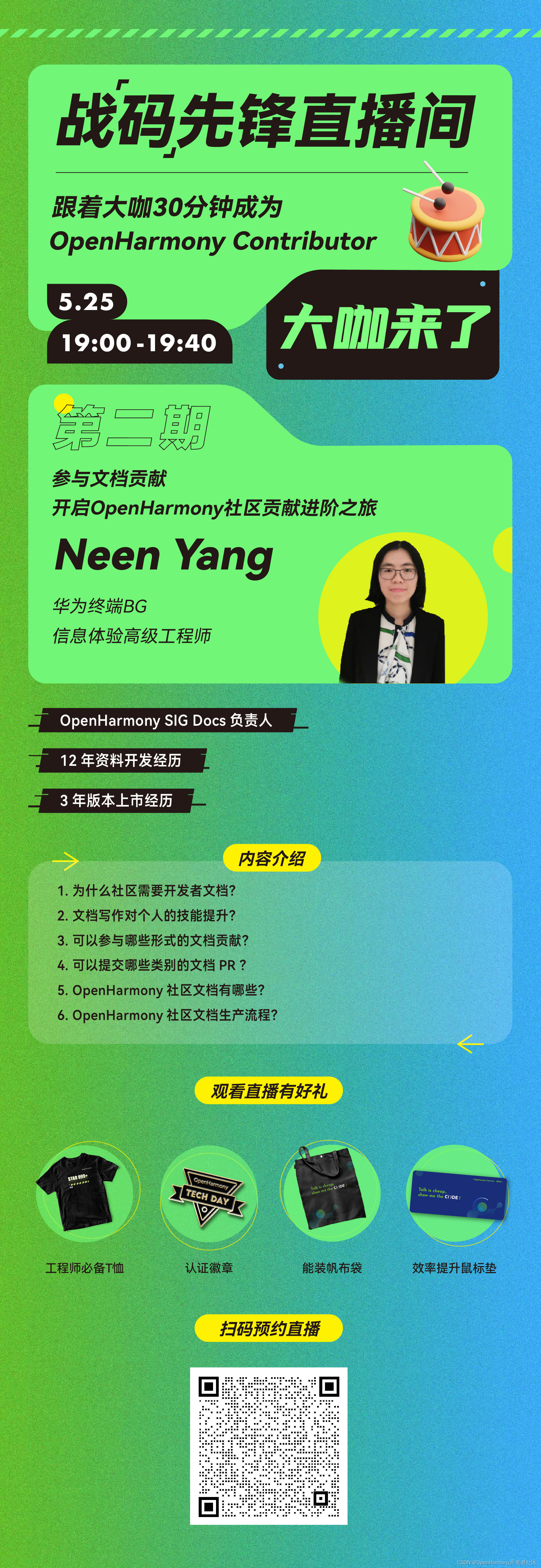 5月25日(周三)晚上19:00,第二期战“码”先锋直播,我们邀请到了华为终端BG信息体验高级工程师、OpenHarmony SIG Docs负责人Neen Yang老师,在直播间与大家分享《参与文档贡献,开启OpenHarmony社区贡献进阶之旅》——本次分享,Neen Yang老师将从6个方面分别介绍为什么社区需要开发者文档、文档写作对个人的技能提升、可以参与哪些形式的文档贡献、可以提交哪些类别的文档PR、OpenHarmony社区文档有哪些以及社区文档的生产流程等内容。