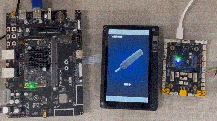 当周围有金属靠近时,设备端蜂鸣器会发出警报并把检测信息通过 Wi-Fi 模组发送给应用端。在应用端收到检测信息之后,会通过屏幕显示检测状态并语音播报检测结果。