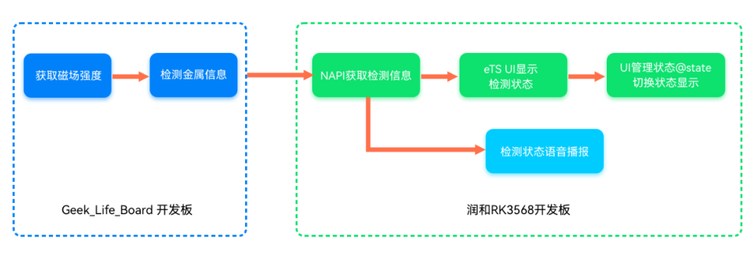 Geek_Lite_Board 开发板通过 AK8963 电子罗盘芯片获取地球磁场强度。通常地球的磁场强度是 0.4-0.6 高斯,当金属靠近电子罗盘芯片时,根据电磁感应原理,金属在磁场中的感应会引起磁场信号的变化。Geek_Lite_Board 开发板通过 Wi-Fi 与润和 RK3568 开发板实时通信,把检测到的信息实时上传。润和 RK3568 开发板作为应用端,采用方舟开发框架(ArkUI)基于 eTS 扩展的声明式开发范式编写页面,通过 NAPI 接口接收设备端 Geek_Lite_Board 开发板的检测信息,使用 OpenHarmony 媒体子系统中的音频播放功能实现语音播报金属检测状态。