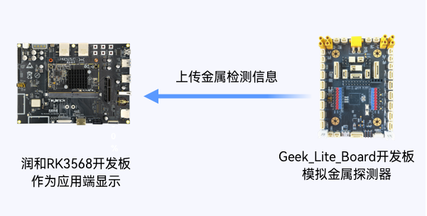 本项目由 Geek_Lite_Board 开发板和润和 RK3568 开发板构成,Geek_Lite_Board 开发板主控芯片为 STM32F427IIH6,作为设备端检测磁场强度的变化,使用的是 OpenHarmony 3.0 LTS 版本。润和 RK3568 开发板是由润和软件研发,采用瑞芯微 RK3568 芯片,作为应用端显示金属探测信息,使用的是 OpenHarmony 3.1 Release 版本。