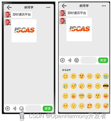 emoji是即时通讯软件不可缺少的一部分,可以更加生动地表现用户的聊天情感。在样例中,用户通过点击聊天界面的emoji按钮,即可找到目前应用内支持的所有样式的emoji,随后可以选择具体样式并将其发送给好友。