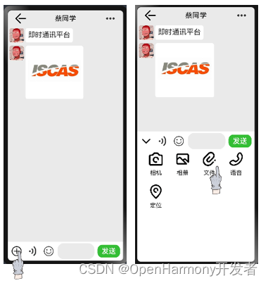 文件转发是即时通讯办公场景下的重要功能。样例中的文件功能支持文件消息的发送、接收和下载。用户通过点击聊天界面的“+”按钮,选择“文件”按钮,完成本地文件的浏览,随后可以选择是否将文件发送给好友。这个功能的实现包括三个步骤:(1)文件的选择;(2)文件上传到服务器;(3)文件的接收。
