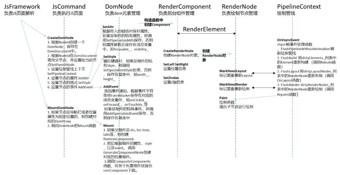 对于类Web开发范式组件,根据组件从前端到后端的过程,可以将整个框架划分为JsFrameWork、DomNode、ComPonent、RenderNode四个模块。其作用分别如下: