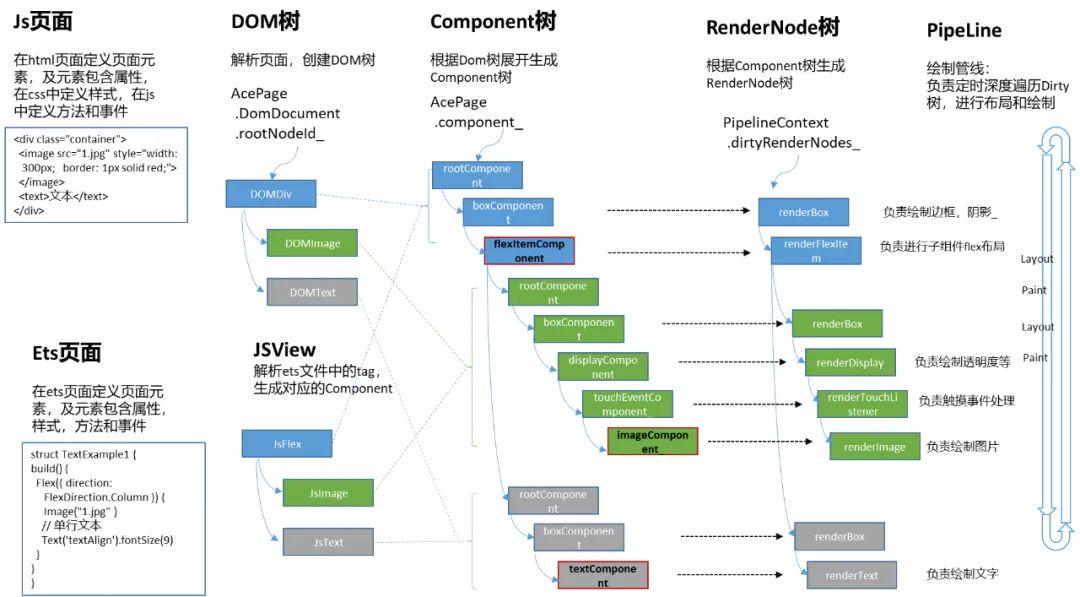 ACE_Engine框架整体代码较复杂,涉及的类别也比较多。本文介绍了一个ACE组件从前端的页面描述,到中间层三棵树的创建和属性传递,以及最终进行UI布局和绘制的整个过程。该过程总结一下就是:JS页面 —> Dom树 —> Component树 —> Render树,最后绘制Render树。大家只要理解这个基本过程,再结合代码关注重点流程,就能够对ACE_Engine框架的代码有整体的理解。在此基础上可以进行ACE组件的增强功能开发,包括新增一个ACE组件等。