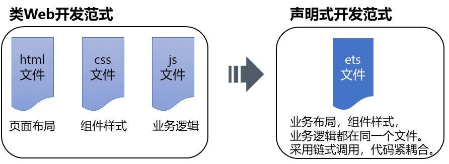 ACE_Engine提供的组件分为两种类型,即类Web开发范式类型和声明式开发范式类型。其中类Web开发范式中定义一个页面需要三个文件,html,css和js文件。html文件负责页面布局,css文件负责定义组件的样式,js文件负责业务逻辑实现。而声明式范式仅需要1个ets文件,页面布局和组件的样式以及业务逻辑实现都在此文件中。如图: