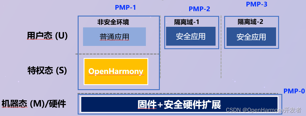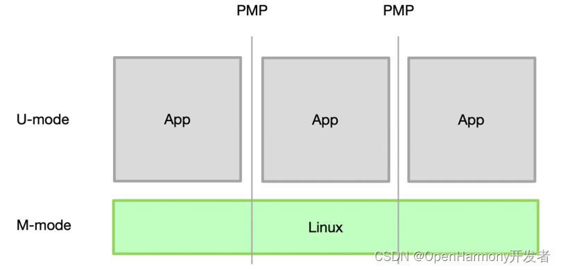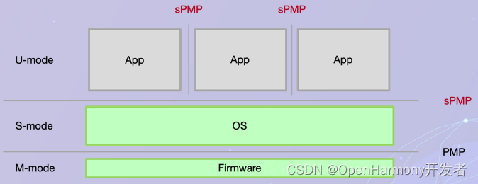 在蓬莱-OpenHarmony中,提出了新的RISC-V硬件扩展:sPMP。sPMP是轻量级的内存隔离机制,存在硬件资源开销低、访存性能好的优势。有sPMP和没有sPMP的区别在什么地方呢?当没有sPMP时,机器态是有内存隔离的,但是用户态和OS态之间没有任何隔离,很难在上面运行多个APP;有sPMP后,操作系统依赖sPMP寄存器就可以实现隔离,补齐了机制缺陷。