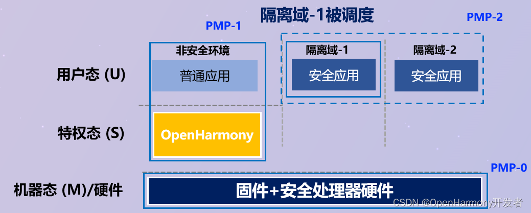 那么可信执行环境如何提供可扩展的隔离域呢?在云场景中,可以利用软件隔离出更多隔离域,但在边端由于内存资源不足并不适用。针对此问题,蓬莱-OpenHarmony提供了滑动窗口的隔离域设计,使一组PMP (逻辑上) 保护多个隔离域,在上下文切换时滑动实际的保护范围。如图所示,当隔离域-1被执行时,PMP-2能够将隔离域收缩至隔离域-1的范围;反之,当隔离域-2被执行时,PMP-2也能够将隔离域收缩至隔离域-2的范围。如此一来,能够保证每一个隔离域执行时,其内存保护的范围是准确的。