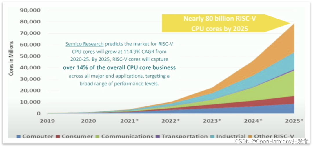 在RISC-V生态中,开发者可以自身需求定制化设计硬件而无需担心版权风险,如果硬件的特性足够好,还可以将其合入到RISC-V的官方指令集中。截至2022年,RISC-V处理器出货量达到100亿,Semico Research预测到2025年,RISC-V处理器出货量将达到800亿,构建了强大的影响力和生态。