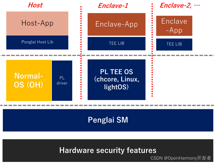 蓬莱-OpenHarmony的整体架构如下图所示。蓬莱-OpenHarmony基于上述定义的OpenHarmony TEE参考架构;在硬件上进行了创新,面向万物互联异构的场景,提出了细粒度的轻量隔离,其安全特性是可配置和可选的;在软件上也进行了创新,面向多元隔离的需求,支持安全OS和轻量安全应用;此外,蓬莱-OpenHarmony也支持OpenHarmony标准、小型、轻量等配置。