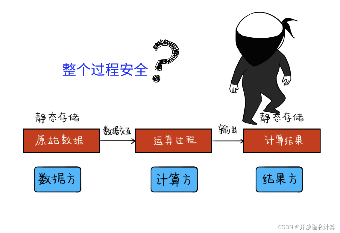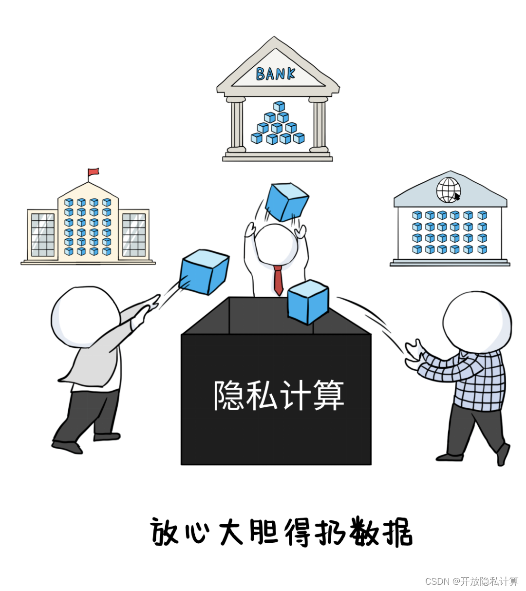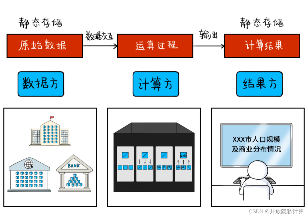 隐私计算从数据使用角色角度看包括三个方面:数据输入方、数据计算方与结果使用方。