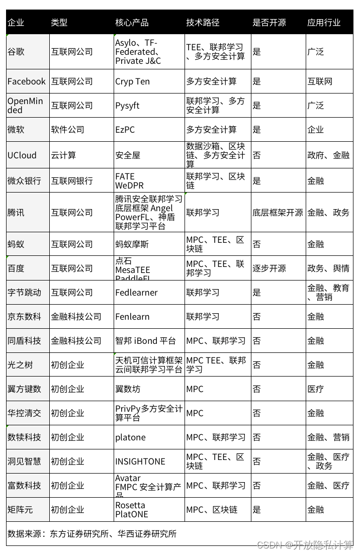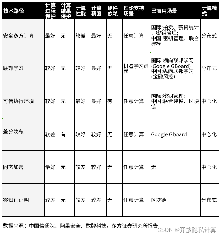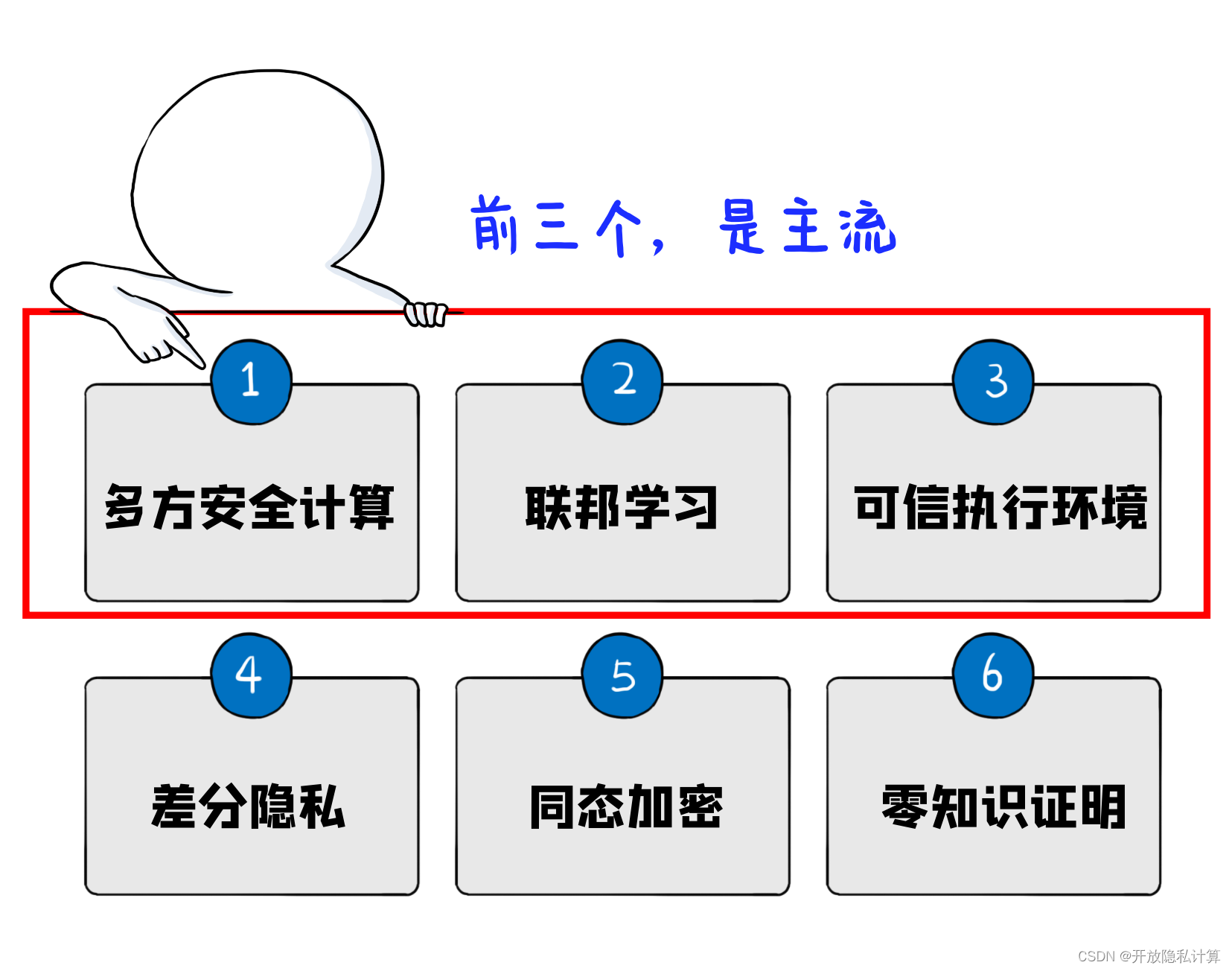 ①多方安全计算 ②联邦学习 ③机密计算(包括可信执行环境)④差分隐私(包括本地差分隐私)⑤同态加密 ⑥零知识证明
