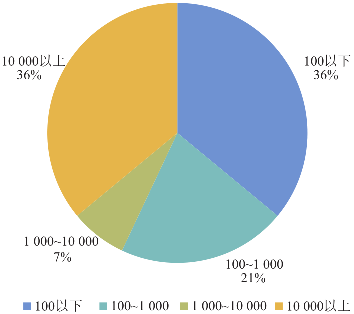 不同金融场景间的差异,除选用算法不同外,还反映在不同场景的数据规模上。根据中国信息通信研究院的调研统计,应用数据量在100 万以下占比36%,多为金融机构在与政务或其他金融机构数据联合计算的场景;应用数据量在1 亿以上占比36%,多为金融机构在与通信、互联网数据联合计算的场景(见图3)。总体来看,应用的数据量在100 万以下、介于100 万~1 亿之间、1 亿以上三个区间呈哑铃状分布,反映目前隐私计算在金融应用中不均衡、不充分。