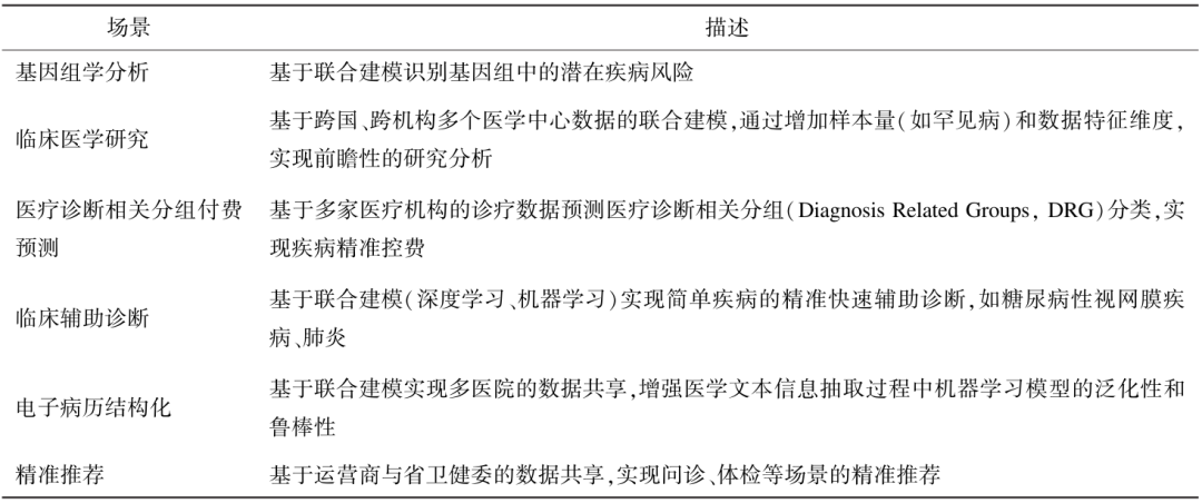 在隐私计算医疗应用场景中,数据融合应用主要有两种形式,一是跨医疗机构之间的数据共享流通,二是医疗开放数据与政企等单位数据的融合应用。数据提供方多是医疗机构、基因测序机构、科研机构等,数据使用方则是医疗机构、科研机构、制药企业等,主要用于基因组学分析、群体遗传学分析等医学研究、药物研发、辅助诊疗和疫情防控等方面。目前,主要的应用场景参见表3。