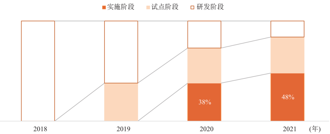 随着政策与需求的双重推动,隐私计算技术和产品的成熟度迅速提升,从2018年起逐渐由研发阶段转化到实施阶段。根据隐私计算联盟统计[10],进入实施阶段的产品比例逐年提升,截至2021年年底进入实施阶段的产品比例由2020年的38%上升至48%,部分产品能够支持较大规模应用的实施(见图1、图2)。