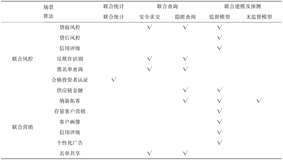 表2 隐私计算在联合风控、联合营销场景常用算法