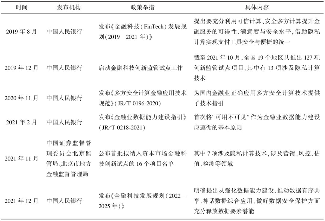 金融行业作为数字化应用最为广泛的行业之一,在数据采集、生产、挖掘中有着丰富的积累与需求,数据价值贯穿于金融风控、营销、运营等全业务流程。随着数据合规、信息安全、隐私保护的要求趋严,在政策举措[11-13]指引下,隐私计算在金融行业呈现出较大的应用空间(见表1)。