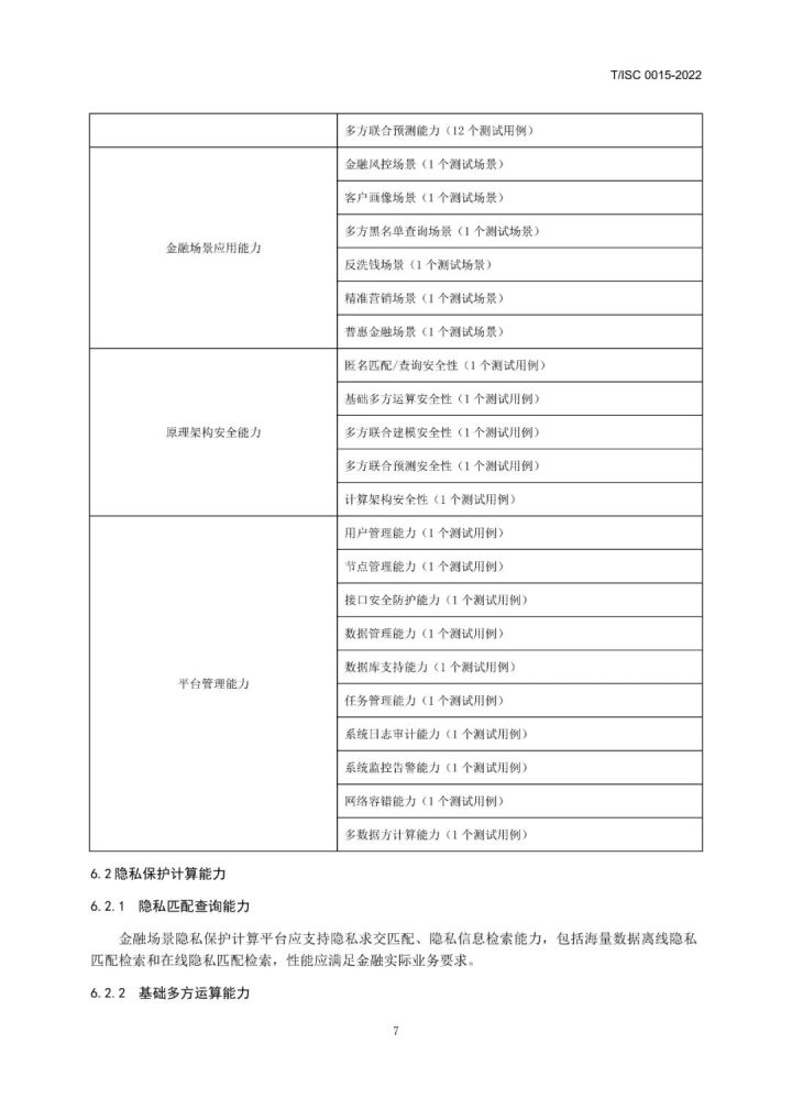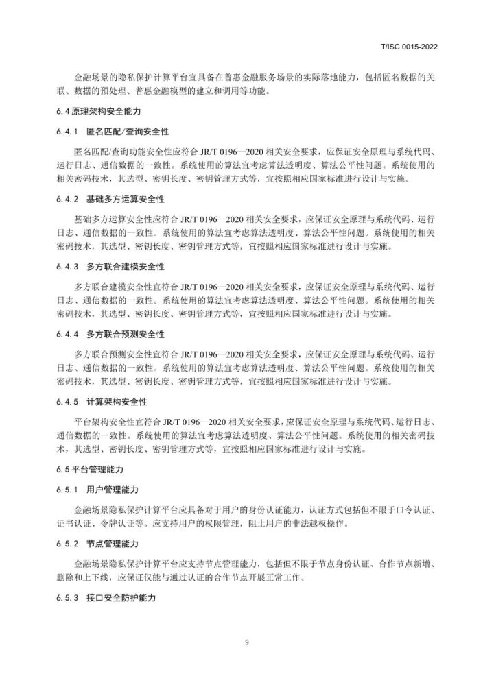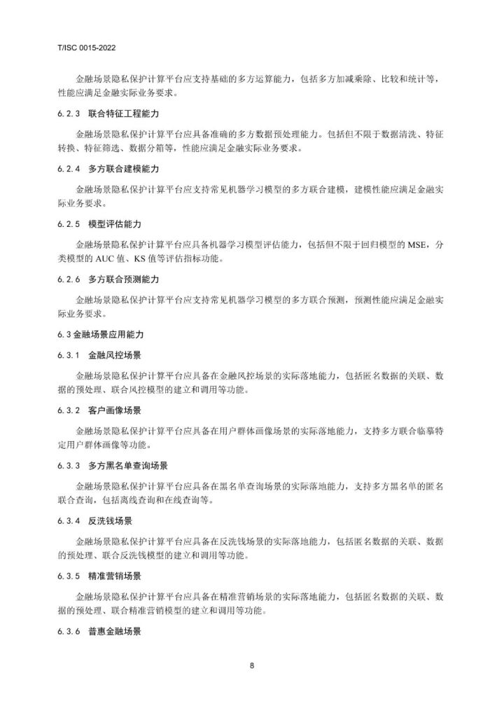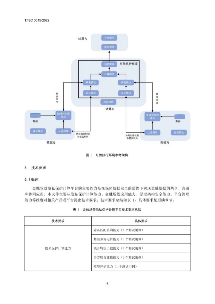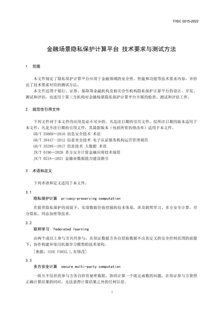 中国互联网协会发布了《金融场景隐私保护计算平台技术要求与测试方法》标准,详细规定了联邦学习、多方安全计算及可信执行环境的参考架构,并提出了隐私保护计算平台所需具备的能力,包括隐私匹配查询、基础多方运算、联合特征工程、联合建模与预测等功能。