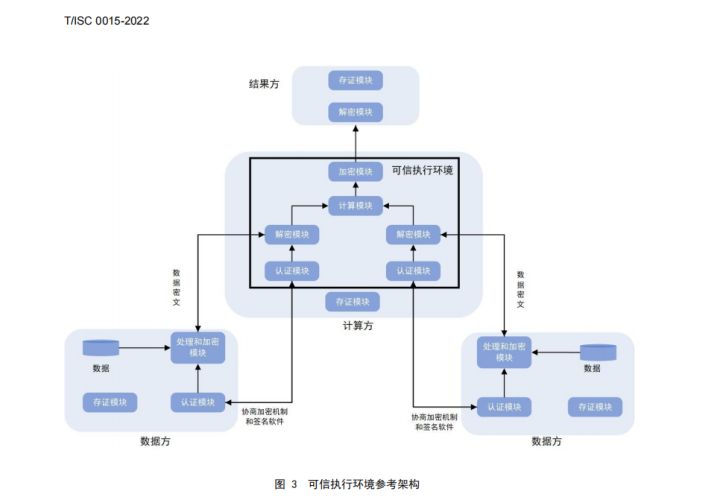 在可信执行环境架构中,参与方主要承担的角色包括数据方、计算方和结果方。数据方是指可信执行环境架构中提供原始数据的参与方,通常由存证模块、数据处理和加密模块、认证模块和数据组成;计算方是指提供计算平台的参与方,计算平台通常由存证模块、认证模块、数据加解密模块、计算模块组成,基于可信硬件的可信执行环境通常部署在计算方;结果方是指获取最终计算结果的参与方,通常由存证模块、解密模块组成。其中,数据方的数据在进行处理后,通过加密密钥进行加密,再上传到计算方的可信计算环境中,计算方通过解密密钥对加密数据进行解密后,发送给计算模块,对解密后的多方数据进行相关计算,计算结果加密后发送给结果方,确保隐私信息不会泄露,整个过程中存证模块可通过日志、区块链等对数据使用等关键信息进行记录,便于审计和追溯。可信执行环境参考架构图 3所示。