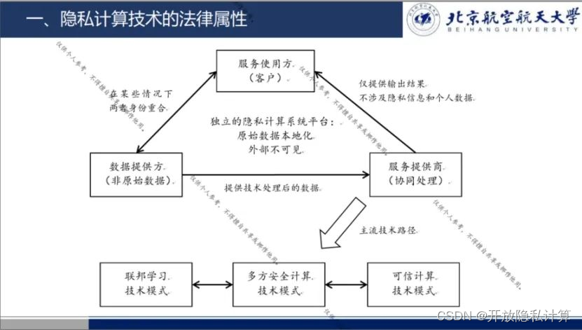 隐私计算技术的法律属性,首先确定主体,有数据提供方、服务提供商、服务使用方。服务提供商可以通过联邦学习、多方安全计算、可信计算等技术模式协同处理数据,仅提供输出结果,不涉及稳私信息和个人数据。数据提供方和服务使用方在某些情况下身份重合,这三方共同构建了独立的隐私计算系统平台,使得原始数据本地化,外部不可见。那么在特定的技术模式下,法律属性该如何确定非常关键。比如服务提供商需要承担一定数据泄露的法律风险。