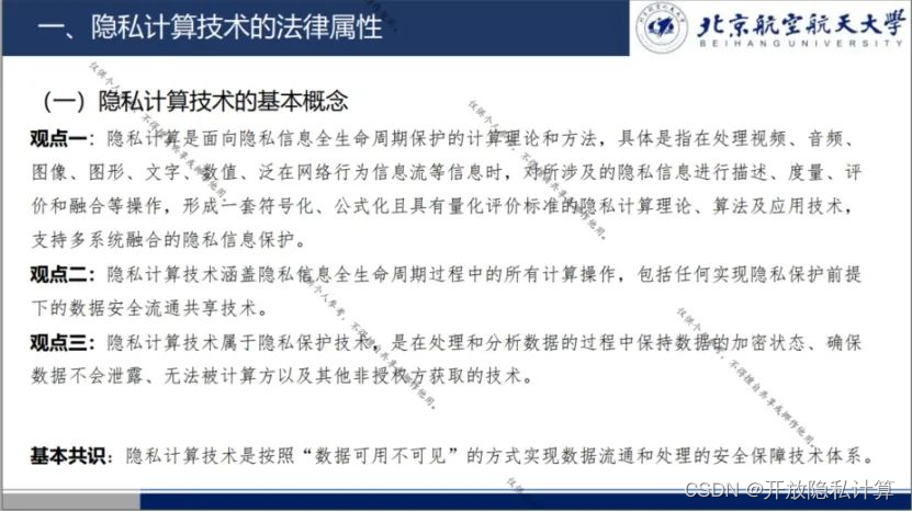 - 观点三:隐私计算技术属于隐私保护技术,是在处理和分析数据的过程中保持数据的加密状态、确保数据不会泄露、无法被计算方以及其他非授权方获取的技术。