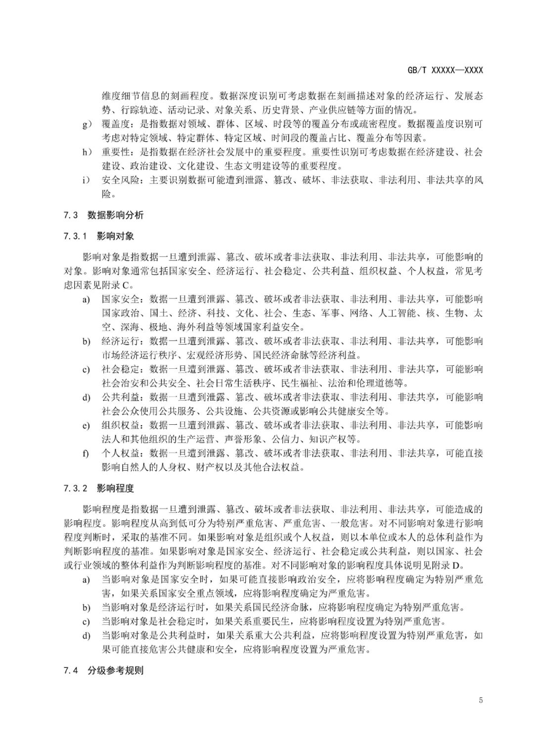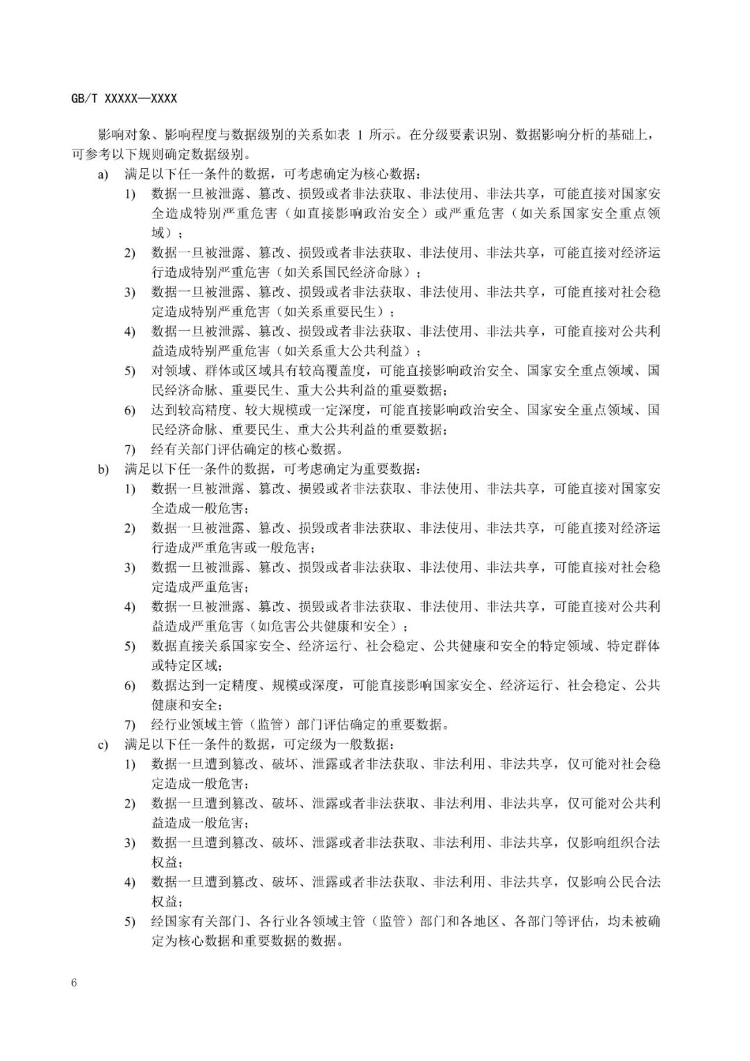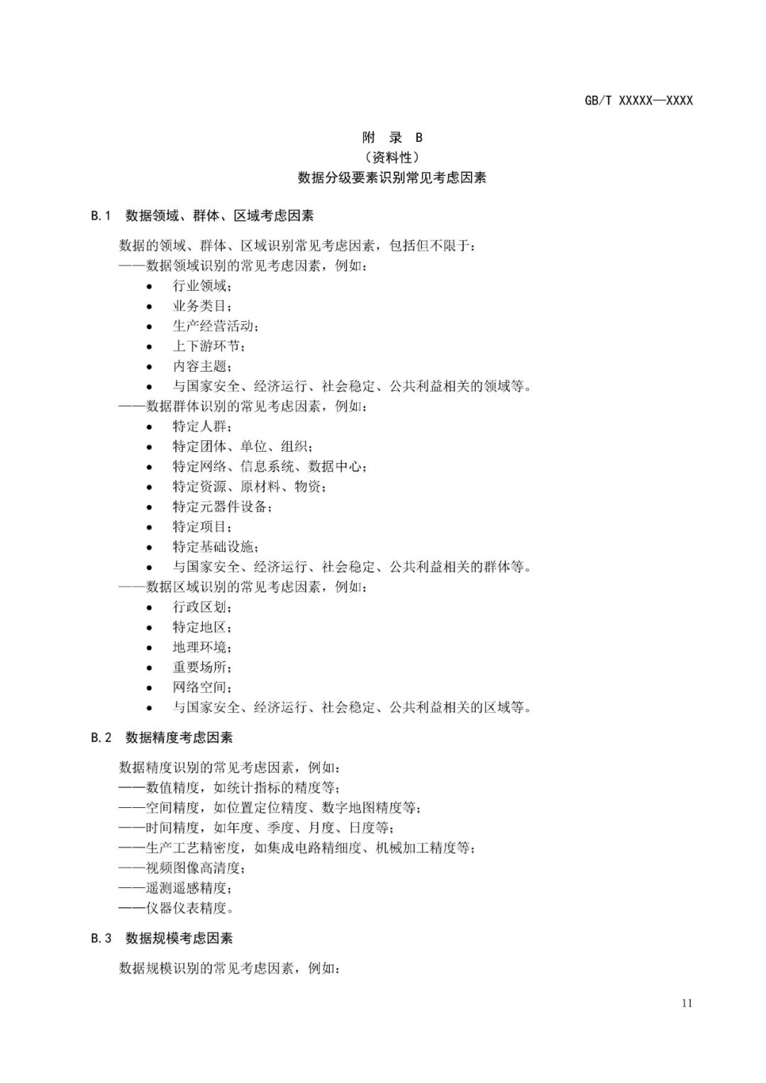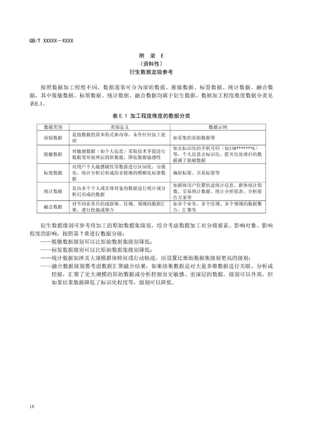 影响数据分级的要素,包括数据领域、群体、区域、精度、规模、深度、覆盖度、重要性、安全风险等,其中领域、群体、区域、重要性、安全风险通常属于定性要素,精度、规模、覆盖度属于定量要素,深度通常作为衍生数据的分级要素。