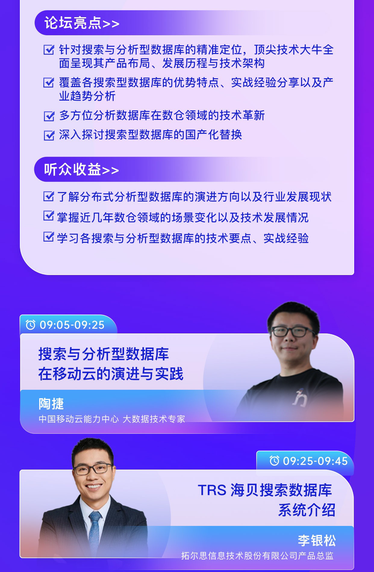 大会以“自主·创新·引领”为主题,开设金融、电信、互联网、汽车四大行业分论坛以及云原生与开源数据库、搜索与分析型数据库、数据库运维及生态工具、时序时空及图数据库四大分论坛,邀请众多知名院士、行业协会领导、数据库学术大咖、产业链各环节数据库负责人、资深技术专家等共同论道新形势下数据库产业可持续、高质量发展的方法,并针对性解决上述产业发展中的痛点问题。