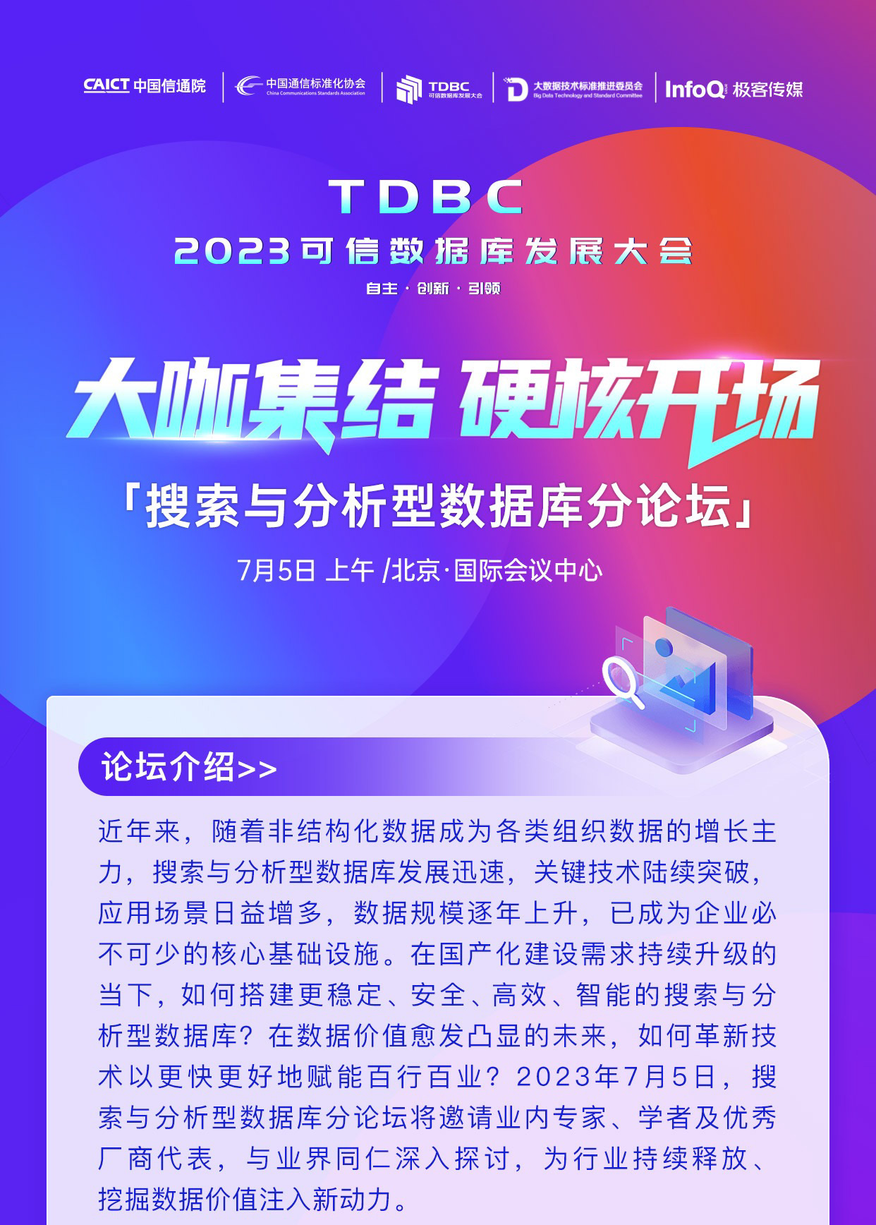 2023年7月4日~5日,由中国信息通信研究院、中国通信标准化协会指导,中国通信标准化协会大数据技术标准推进委员会(CCSA TC601)主办的2023可信数据库发展会将于北京国际会议中心隆重召开。