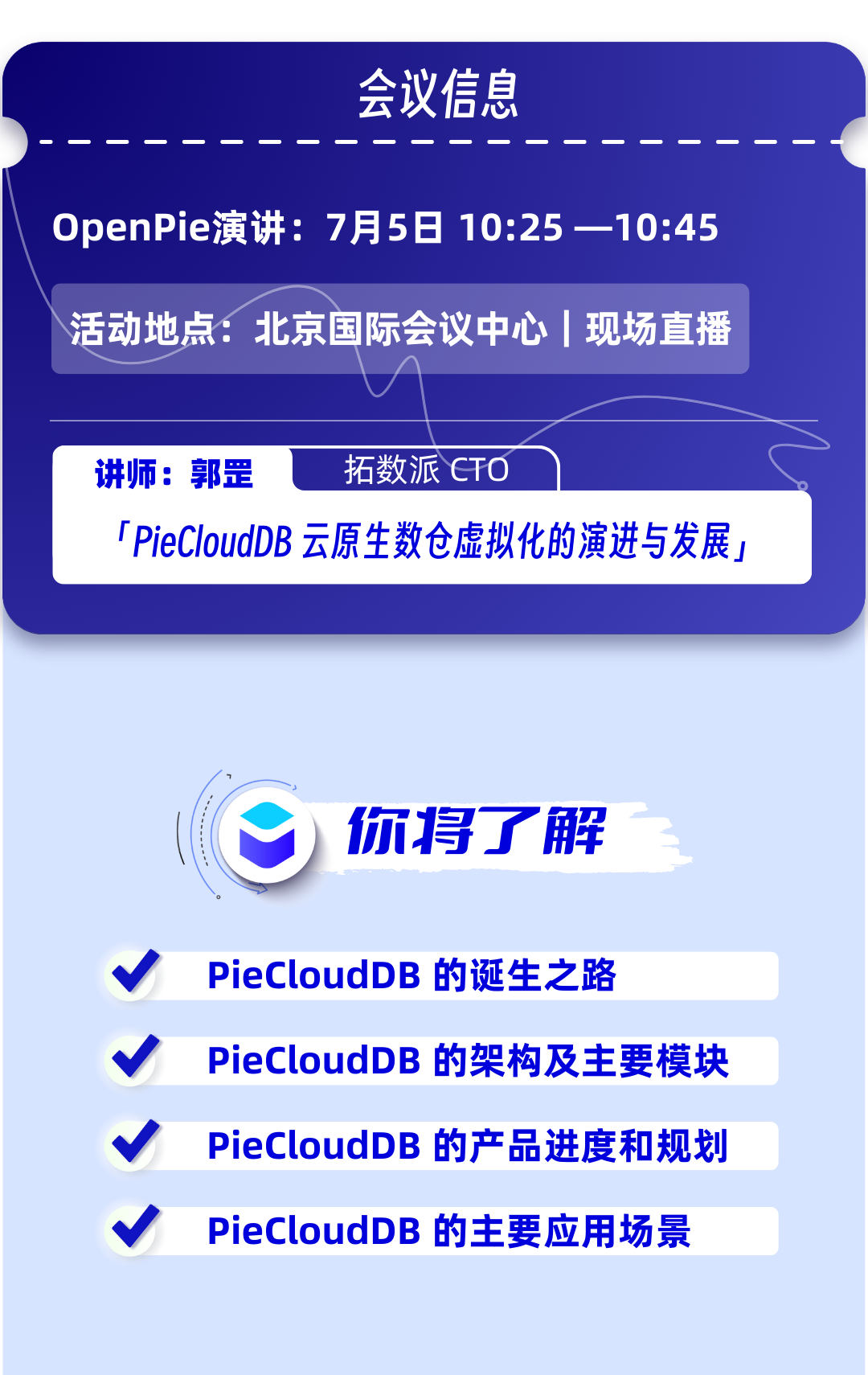 杭州拓数派科技发展有限公司(也称“OpenPie”)立足于国内,基础数据计算领域的高科技创新企业,也将参与本次大会。届时,拓数派 CTO 郭罡将于搜索与分析型数据库分论坛中与大家分享《PieCloudDB 云原生数仓虚拟化的演进与发展》。