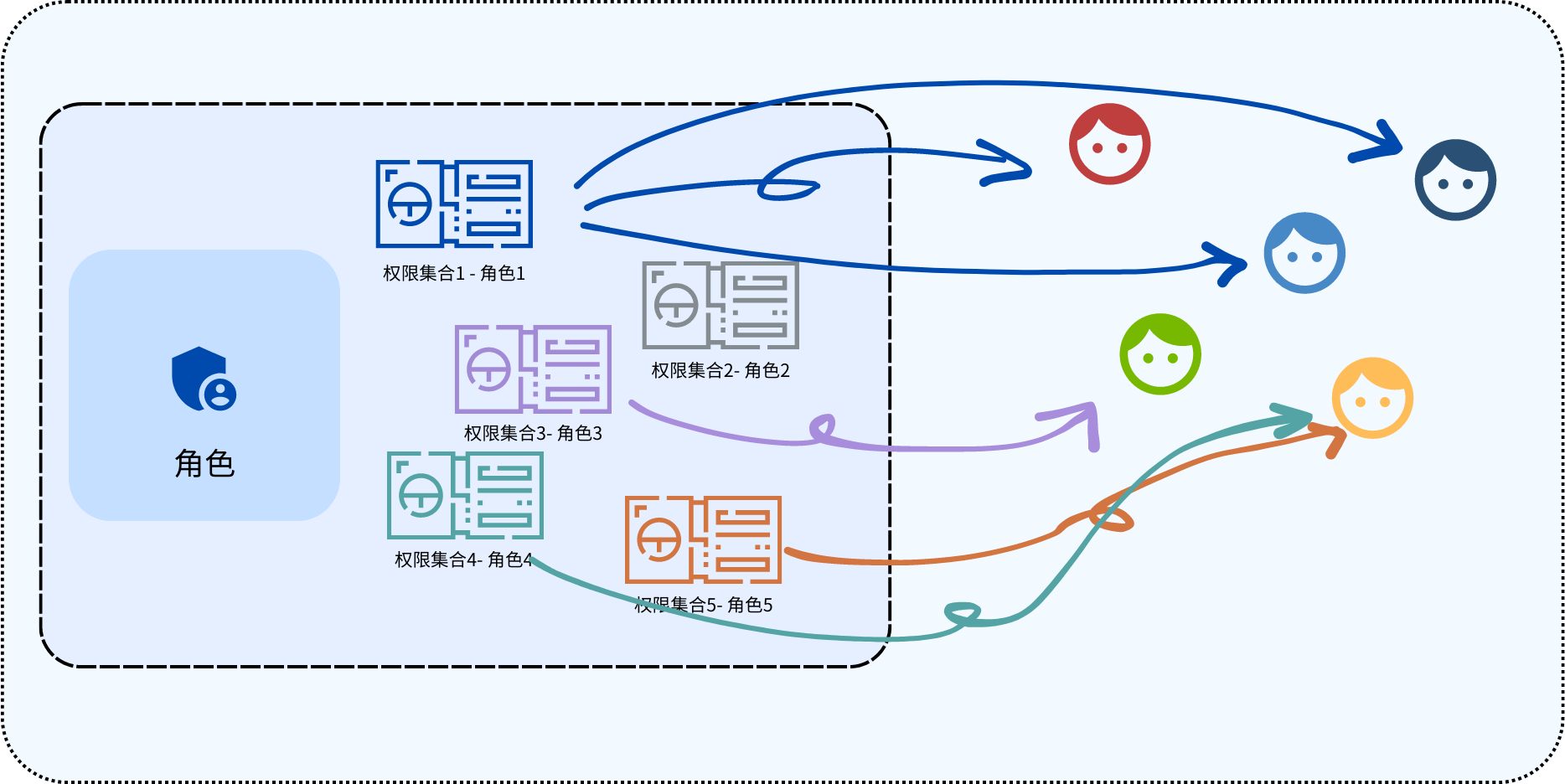 角色是用户权限概念的具象化,代表了权限的集合。权限以角色的方式下放给各个用户。一个角色可对应一个用户,也可对应一类用户。用户与角色并非一对一关系,一个用户可被授予多个角色,而一个角色可被授予给多个用户。每个用户都会被赋予至少一种角色,每一种角色都有其对应的权限。