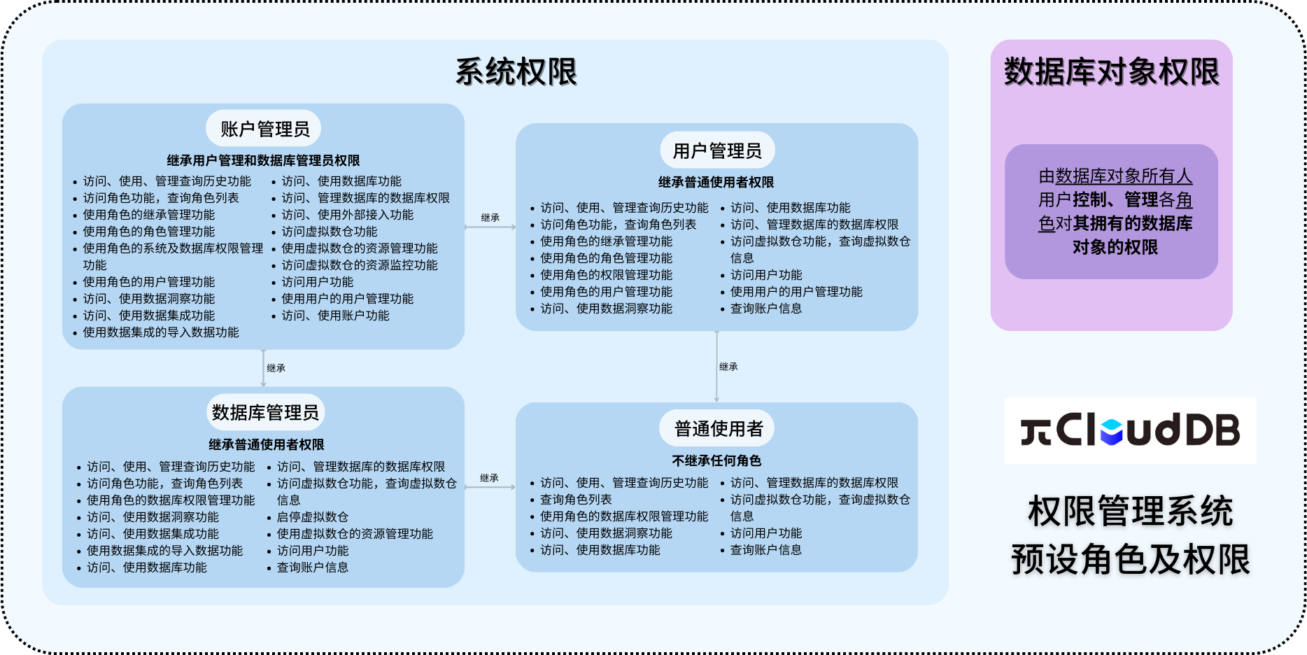 - 账户管理员是账户权限管理系统中等级最高的存在,继承数据库管理及用户管理员权限,也是账户的计费单位。账户管理员可以将权限以角色的方式下放给其他用户进行管理