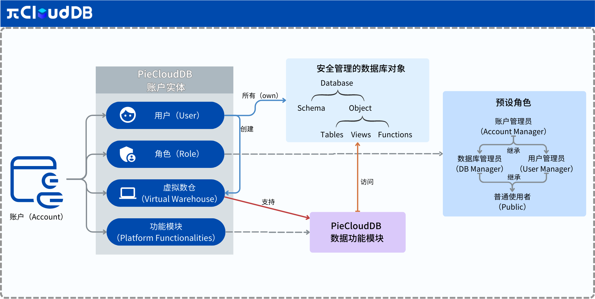 PieCloudDB 以账户实体的形式是账户在数仓实例中具象体现,每一个 PieCloudDB 账户都拥有四类账户实体,如下图所示。