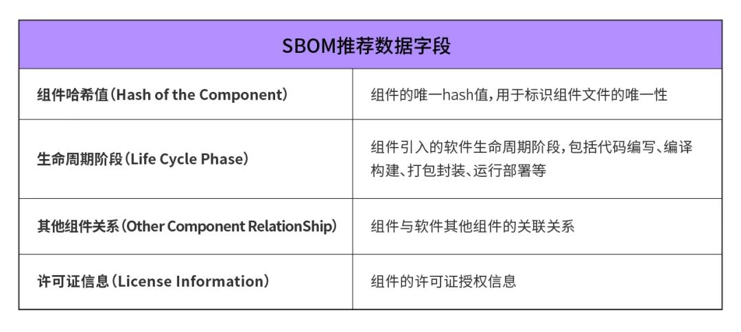 SBOM最小必需元素描述了实践过程中需要的元素最小集,相关组织和机构可通过参考以上三类元素,并扩展企业自身需要管理的额外信息,构成适合自身的标准SBOM清单。从国内开源组件管理要求和软件全生命周期风险角度分析,推荐适合扩展数据字段如下:
