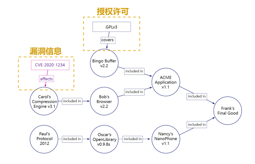 但随着供应链安全事件的升级,2021年7月12日美国在关于改善国家网络安全的行政命令(EO 14028第10节)中将SBOM定义为“包含构建软件中使用的各种组件的详细信息和供应链关系的正式记录”。软件开发商和供应商通常通过组装现有的开源和商业软件组件来创建产品,新的定义将软件供应链关系纳入记录范围。