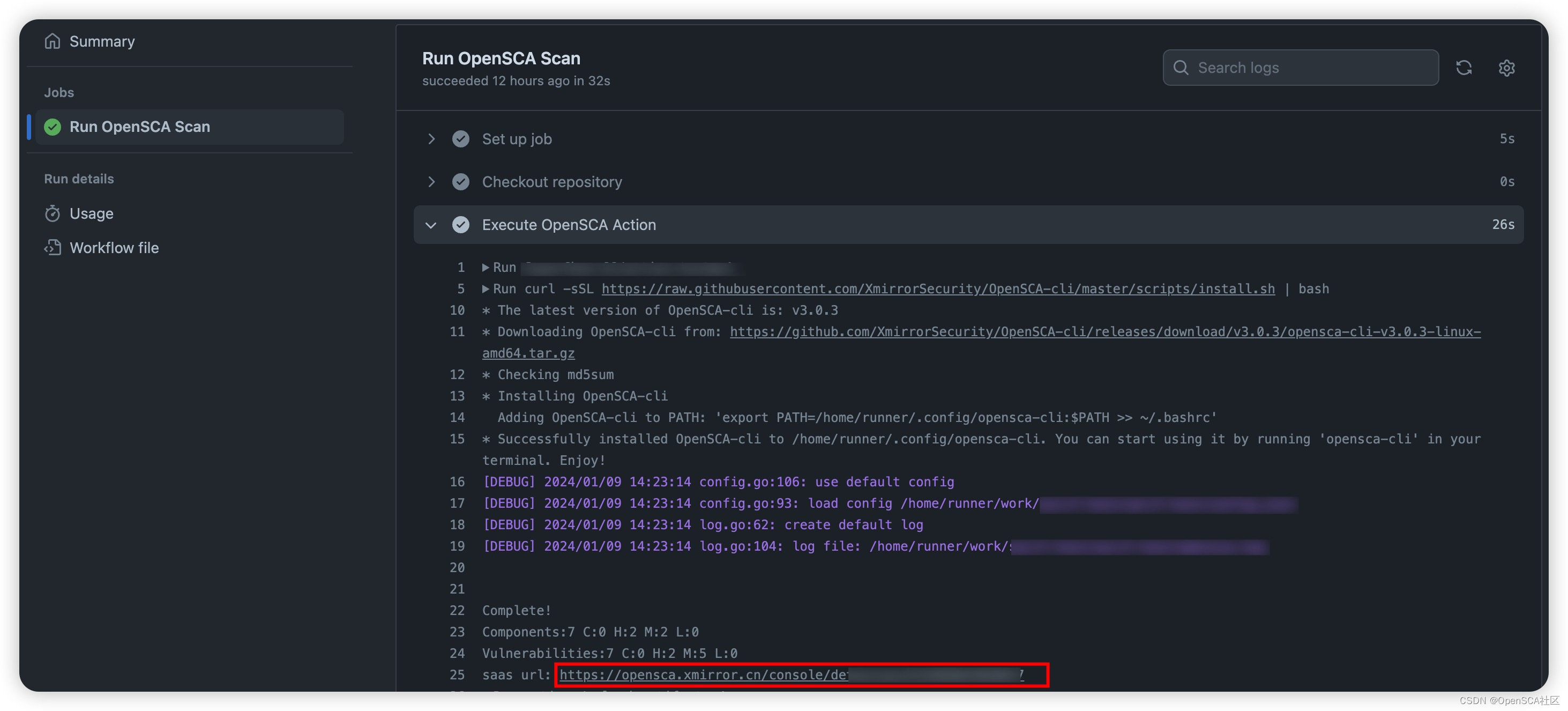 也可直接跳转至 OpenSCA SaaS 查看更多详细信息;跳转链接可在 Action 日志中找到