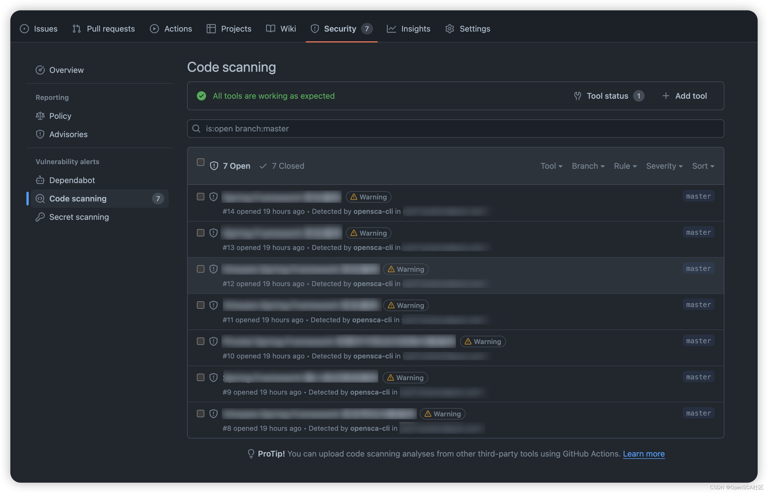 扫描结束后,可在仓库的 Security/Code scanning 里找到结果