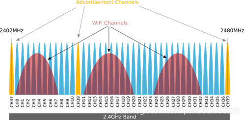 BLE占用的频段为 2402Mhz-2480Mhz, 划分为40个Channel(频道), 每个频道占2Mhz带宽,与2.4G wifi的频段重叠,40个频道中有3个广播频段用来发送广播数据包,它们被放在了与2.4G wifi干扰冲突最少的频段, 被命名为 37,38,39 频道,其余的频段用作数据通讯, 并会采用跳频技术来避免干扰和冲突。在一些情况下,低功耗蓝牙(ble)模块会在3个广播频段上发送数据,例如低功耗蓝牙(ble)的配对过程和ibeacon设备发送广播信息的过程。本文的实验是使用LimeSDR抓取低功耗蓝牙(ble)发送的数据包。<