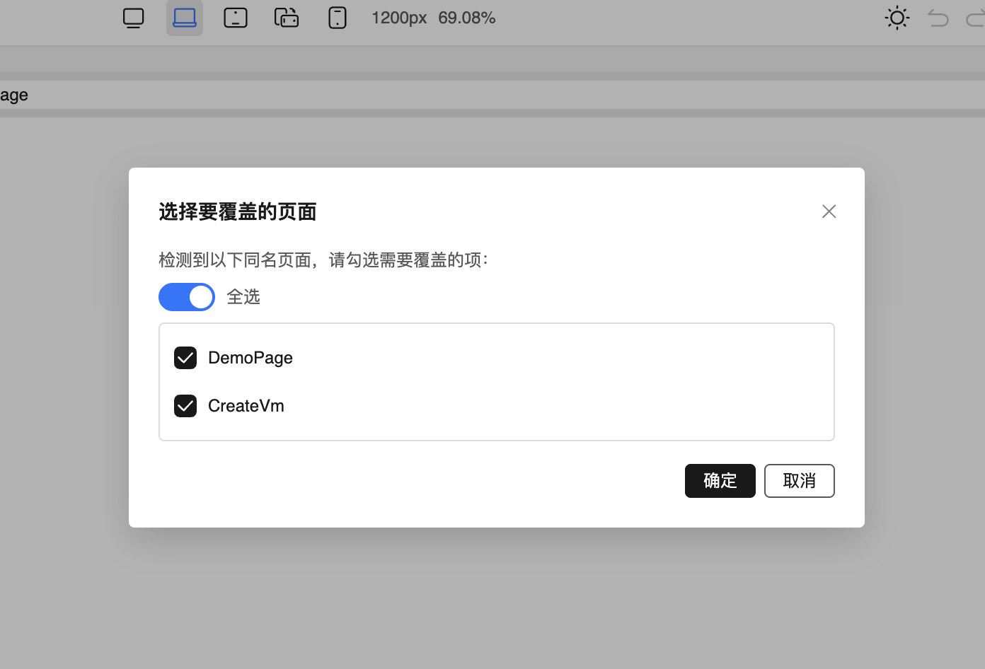 .vue文件。 - 若存在同名页面,按提示“覆盖/跳过/全部覆盖”进行处理。