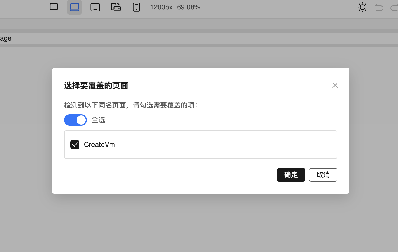 由于已经存在CreateVm页面,弹出了提示框,需要选择是否覆盖,这里点击确定: