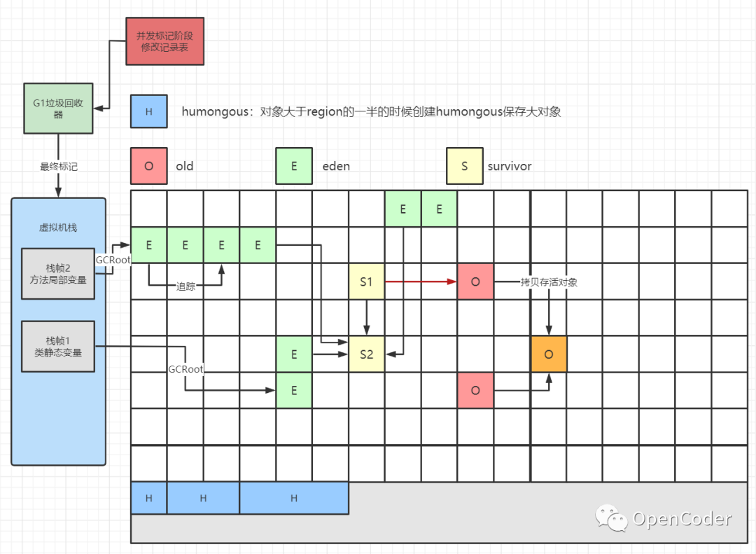此时老年代也是根据标记-复制算法来进行回收的,会将标记存活的对象拷贝到新的Region中作为老年代区域: