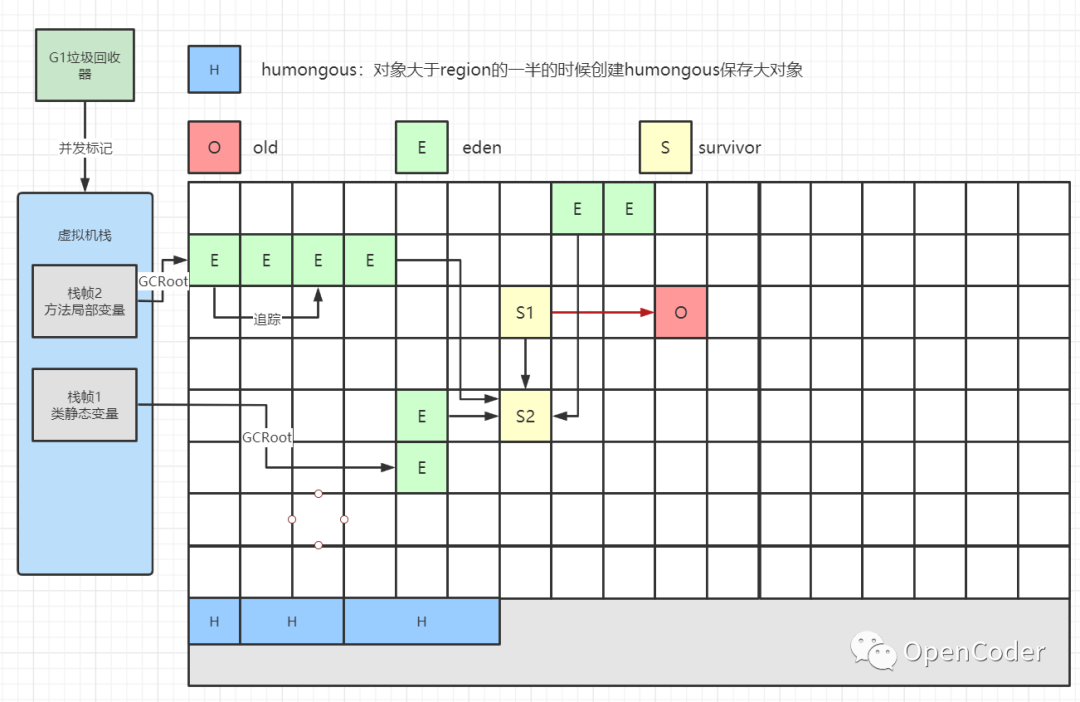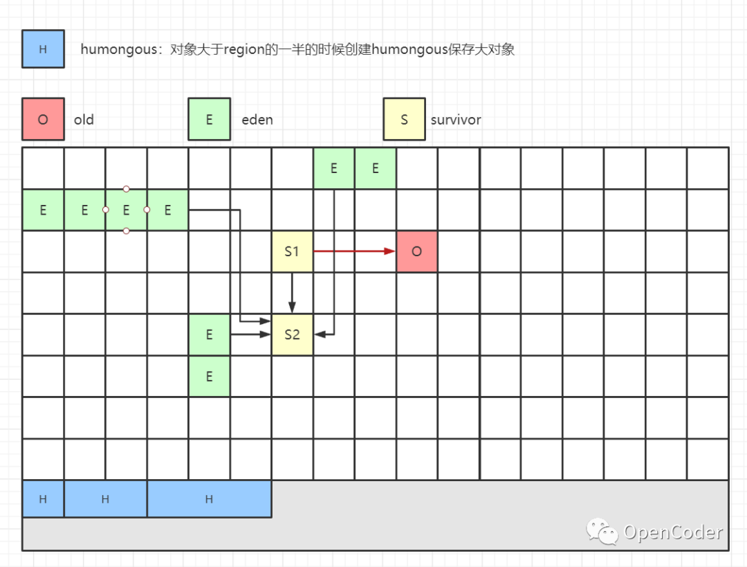 实际根据G1的分配原则,G1会提供专门的Region来存放大对象,而不是让大对象直接进入老年代的Region中,G1中如何判断大对象是根据Region的大小来的,如果一个对象的大小已经超过Region大小的50%了,那么就会被放入大对象专门的Region中,这种Region我们叫humongous,如下图: